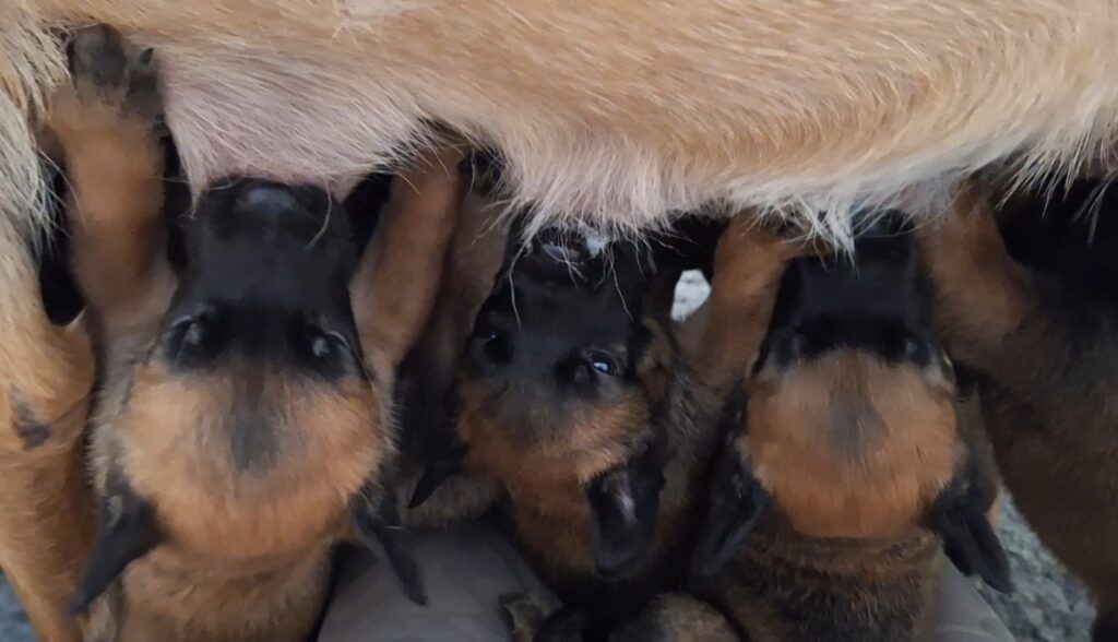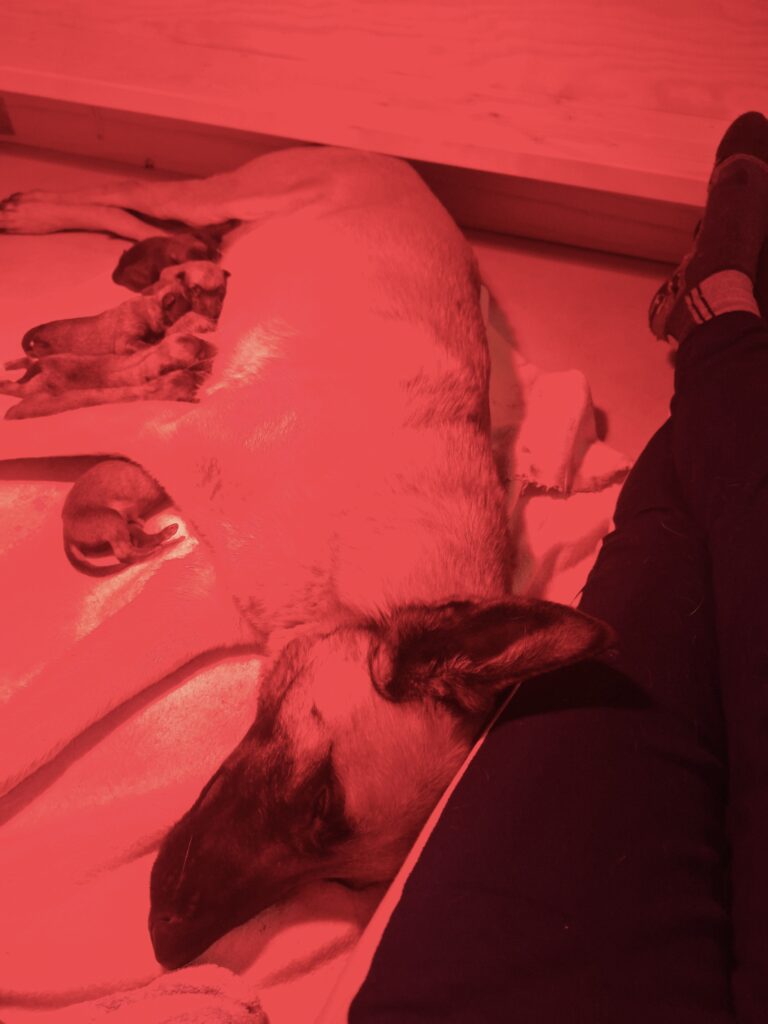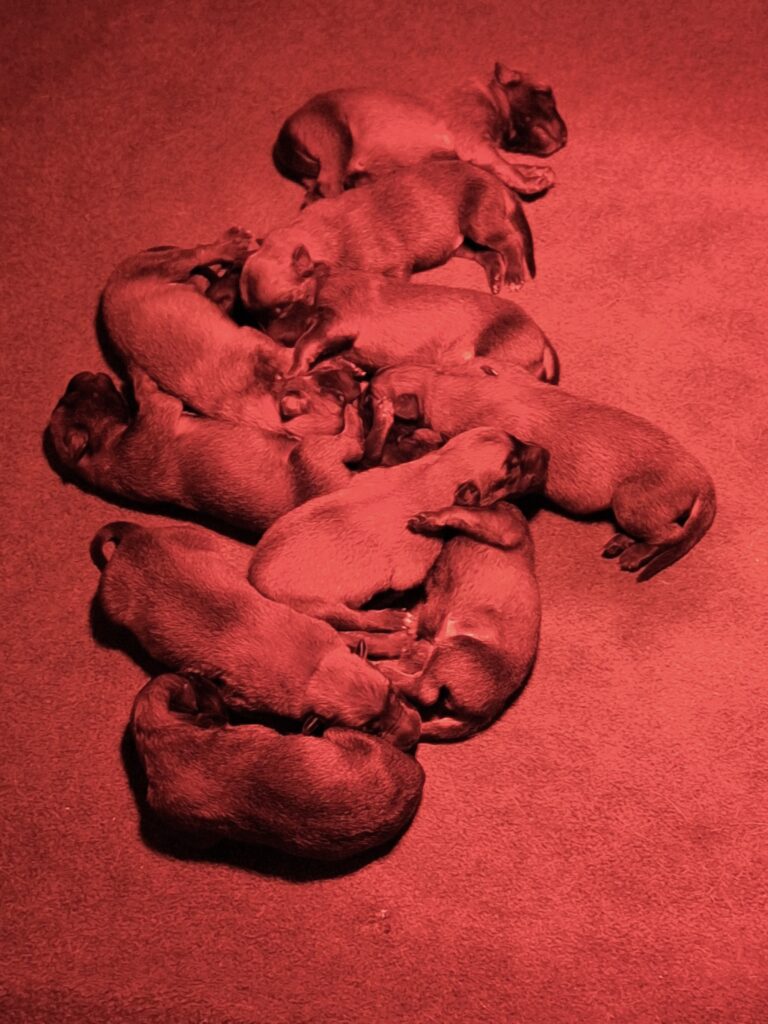 Macy rodila s obrovským klidem a přehledem. Všechna štěňátka byla vitální a jedno jako druhé, za 5 hodin bylo hotovo. Macy je skvělá máma – klidná, láskyplně pečující, nic nepodceňuje, ale ani nepřehání. Když instinkty takto pracují na 100 %, je to paráda.